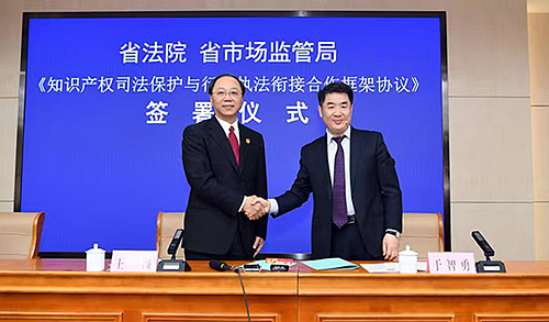同日,省市场监管局(知识产权局)与省高级人民法院举行《知识产权司法保护与行政执法衔接合作框架协议》签署仪式,从诉调对接、案件研讨、调查取证、案件执行、信息互通、资源共享、宣传引导等方面提出16条深度合作内容,实现行政执法与司法保护有效衔接、协同配合,助力产业升级和高质量发展,推动知识产权强省战略实施。