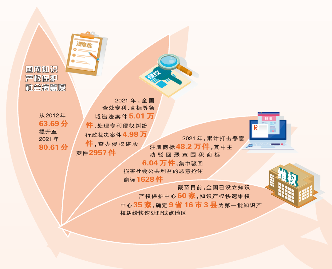 我国知识产权法治建设成就在国际社会有目共睹。中国欧盟商会与罗兰贝格咨询公司共同发布的《中国欧盟商会商业信心调查2020》显示,受访在华欧盟企业普遍认为,近十年来,中国在起草和实施知识产权法律法规方面持续取得进展,中国知识产权的立法与保护水平均显著提升。数据显示,国内知识产权保护社会满意度由2012年的63.69分,大幅提升至2021年的80.61分。