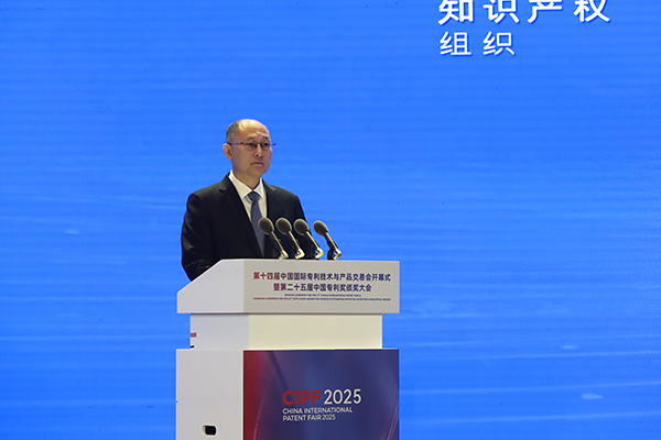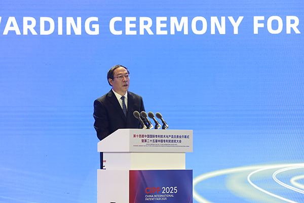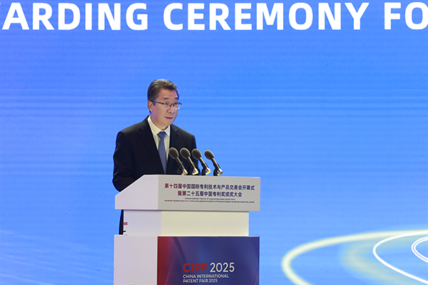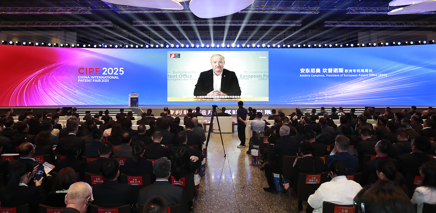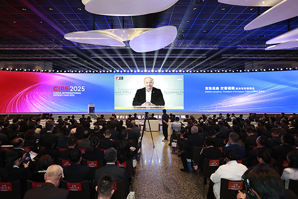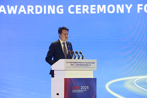 [安东尼奥·坎普诺斯] 我们会走得更远。携手中国国家知识产权局,我们正在商签双边PPH协议。这将让中国申请人在已获得本国授权的情况下,可以快速申请欧洲专利。欧洲专利局和中国国家知识产权局还同意继续在法律框架、授权程序、IT基础设施、外联和翻译方面开展合作,确保我们的合作继续为中国的专利人和机构带来实际利益。最后,我要向第25届中国专利奖获奖者表示祝贺。中国人才济济。就在今年6月,欧洲专利局在冰岛举办了青年发明家奖,一位年轻的中国发明家温柔嘉位列获奖名单之一,她与人合作发明了一种突破性的可改装的船舶碳捕获装置,这是一种有国际潜力的解决方案。今天奖项的规模和范围反映了中国对创新、专利商业化和经济进步的坚定承诺,这是欧洲专利局引以为豪的承诺。感谢你们打造了一个更加光明的未来。