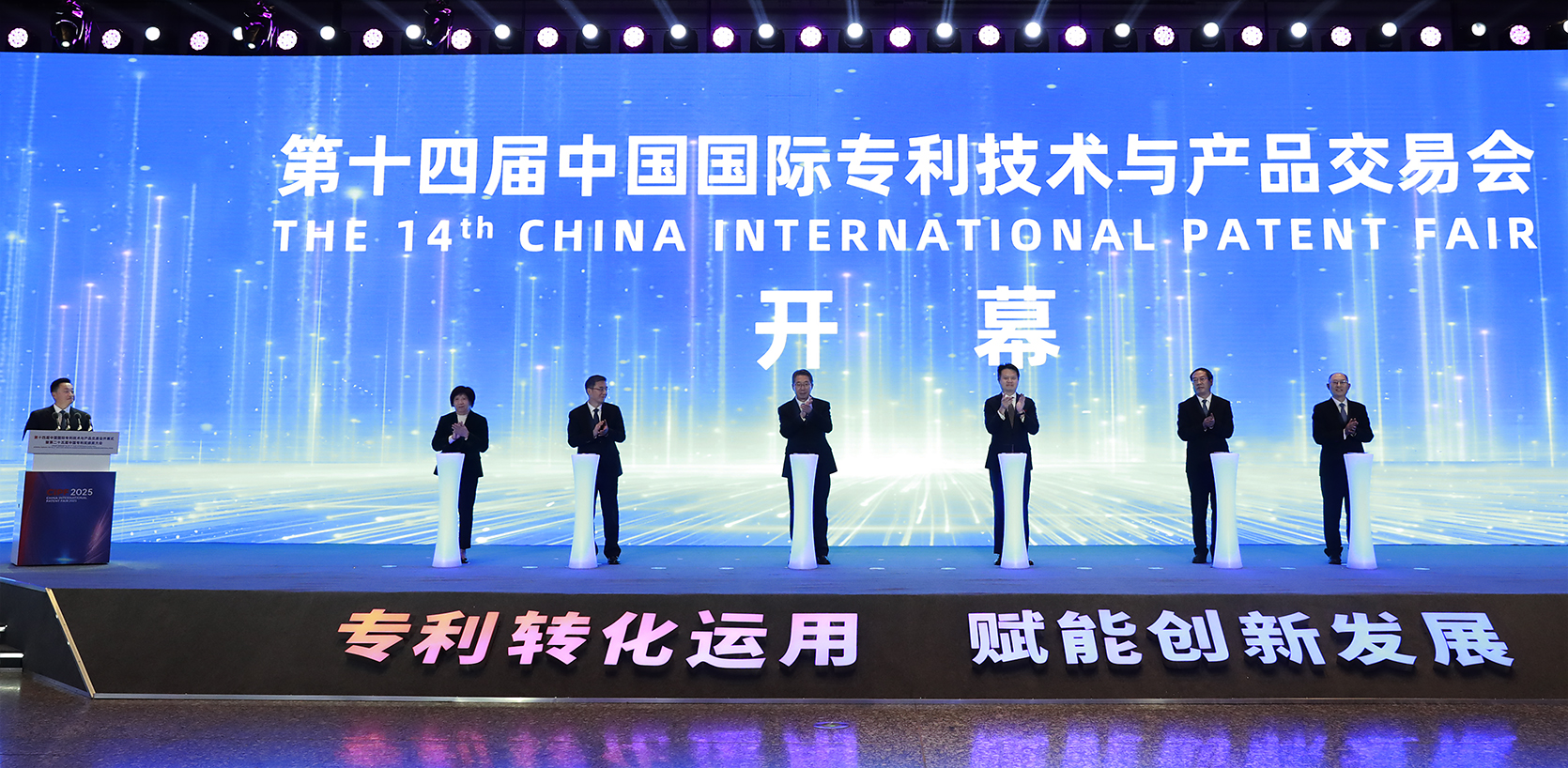 [陈绍旺] 让我们向所有获奖单位表示祝贺!请获奖代表移步观礼区。请各位颁奖领导留步。下面,进行启幕仪式。请各位领导将右手放到启动柱上,共同为第十四届中国国际专利技术与产品交易会启幕。启动!