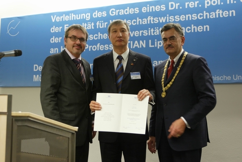 德国专利商标局局长约尔根·沙德博士(Jürgen Schade)、慕尼黑工业大学校长沃夫冈·赫尔曼教授(Walfgang A.Herrmann)、该校经济系主任、慕尼黑市劳工与经济局局长等先后在仪式上致辞,高度评价了中国近三十年来在建立和完善知识产权制度方面所取得的成就,对田力普努力推动中国知识产权事业的发展、积极促进中德知识产权合作以及其在知识产权研究方面的深厚造诣给予了充分肯定。 德国联邦专利法院院长莱蒙德·卢茨(Raimund Lutz)、德国马普学会知识产权研究所前所长、现慕尼黑知识产权法律中心主任约瑟夫·施特劳斯教授(Joseph Straus)、德国专利商标局前局长豪格(Norbert Haugg)等一百余位德国知识产权界知名人士以及中国驻慕尼黑总领事杨惠群、欧洲专利局代表和国家知识产权局办公室主任甘绍宁等出席了荣誉博士授予仪式。(刘剑/文 甘绍宁/摄) |