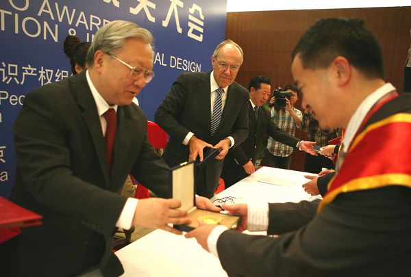弗朗西斯·高锐为获奖者颁奖 本届中国专利奖得到了各地各部门的大力支持和全社会的广泛关注。19个中央部委、46个地方知识产权局、39个行业协会、102名两院院士共推荐了697项优秀专利项目参评,参评项目数量创历史之最。最终经中国专利奖评审委员会评审,国家知识产权局和世界知识产权组织审核,共评选出中国专利金奖项目15项,中国外观设计金奖项目5项,中国专利优秀奖项目177项,中国外观设计优秀奖项目35项。这些项目从上百万件的有效专利中脱颖而出,不仅权利归属明确,技术水平高,而且资源耗能降低,综合效益良好,是当前一段时期内我国加快自主创新,加速知识产权产业化的优秀实例。仅就经济效益而言,自专利实施之日起至2010年底,获得第十三届中国专利金奖的15个项目新增销售额425亿元,新增利润56亿元;获得中国外观设计金奖的5个项目新增销售额19亿元,新增利润7亿元。 另据世界知识产权组织发布的报告显示,2010年,中国的国际专利申请增幅高达56%,国际专利数量位居世界第四。这一方面得益于国家知识产权战略的实施,另一方面得益于创新型国家建设对知识产权发展的迫切需要。(高源/摄) |